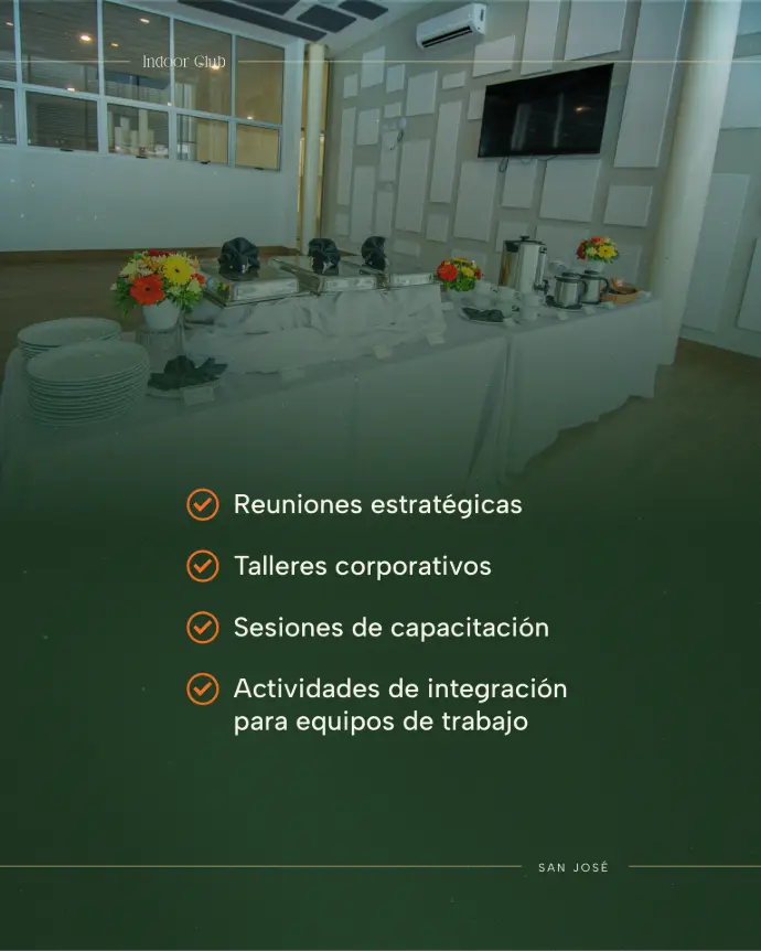 En San Jose Indoor Club ofrecemos el entorno perfecto para que su empresa lleve a cabo reuniones estratégicas, talleres corporativos, sesiones de capacitación y actividades de integración para equipos de trabajo.